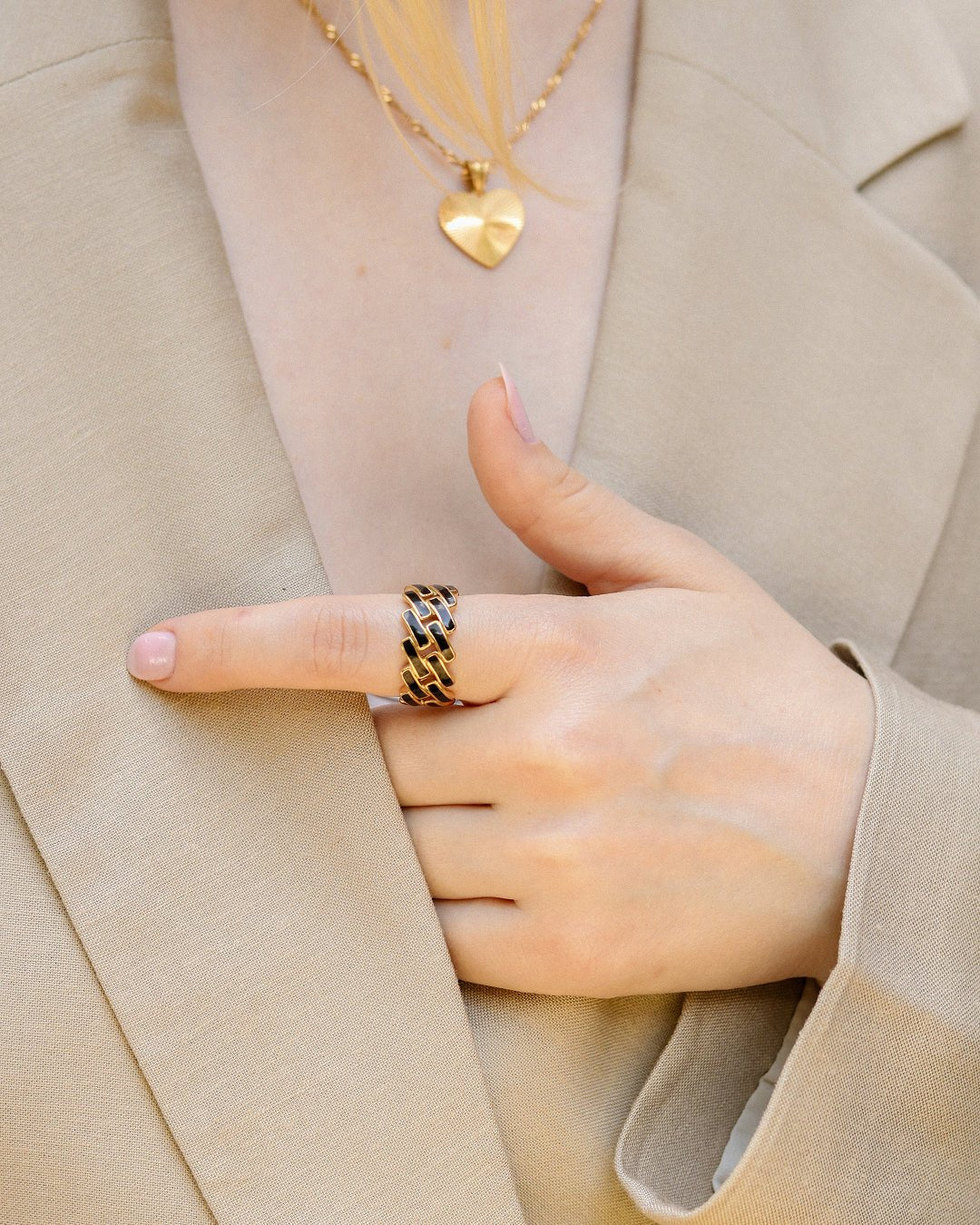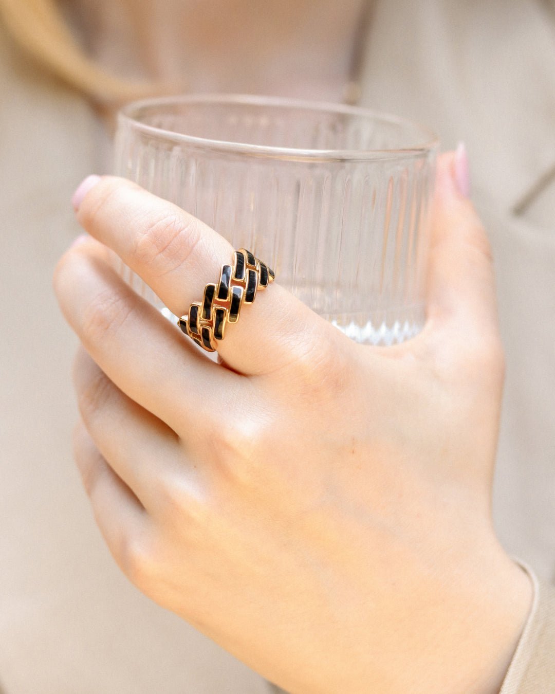 Make a bold statement with the Black Enamel Woven Ring, where modern design meets timeless black colour. Perfect for those who dare to stand out and redefine elegance on their own terms.